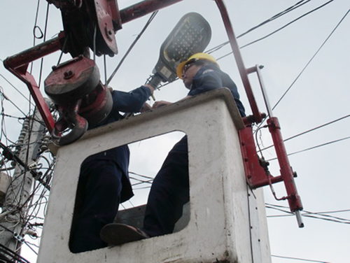 CN đang lắp đèn led cho dự án Cải tạo hệ thống chiếu sáng công cộng bằng đèn led tại TP. Bến Tre