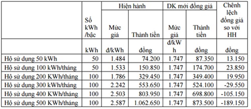 Phương án gây chú ý nhất là viêc bán đồng giá 1.747 đ/kWh. Đây cũng chính là giá điện bình quân của biểu giá điện sinh hoạt hiện nay. Với phương án này, EVN tính toán các hộ sử dụng dưới 240 kWh trong tháng sẽ tăng tiền điện phải trả. Hộ bị tác động cao nhất là sử dụng 100 kWh. Các hộ sử dụng trên 240 kWh sẽ được hưởng lợi.