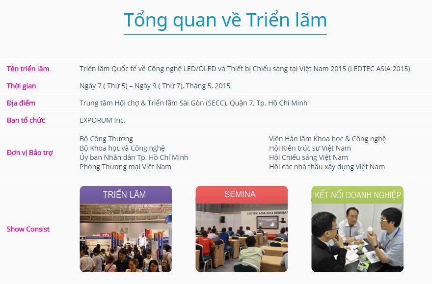 Triển lãm Quốc tế về Công nghệ LED/OLED và Thiết bị Chiếu sáng tại Việt Nam (LEDTEC ASIA) là sự kiện quốc tế nhằm kết nối và giao thương giữa các đơn vị trong ngành. Triển lãm được tổ chức từ ngày 7 (Thứ 5) đến ngày 9 (Thứ 7), tháng 5, năm 2015 tại Trung tâm Hội chợ & Triển lãm Sài Gòn (SECC), 799 Nguyễn Văn Linh, Quận 7, Tp. Hồ Chí Minh. Là Triển lãm thương mại chuyên ngành mang đến cho quý doanh nghiệp cơ hội gặp gỡ khách hàng mục tiêu, cập nhật xu hướng và thành tựu mới nhất của thị trường, LEDTEC ASIA mang lại cho quý doanh nghiệp cơ hội giữ vị trí tiên phong đặc biệt khi thị trường Công nghệ LED và Chiếu sáng thế giới luôn biến động.